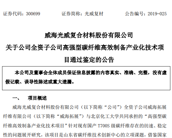 根據公告,該項目由光威復材全資子公司威海拓展纖維有限公司(以下簡稱“威海拓展”)與北京化工大學共同承擔,主要針對現有國產 T700S 級碳纖維存在的紡速、穩定性的問題展開研究。